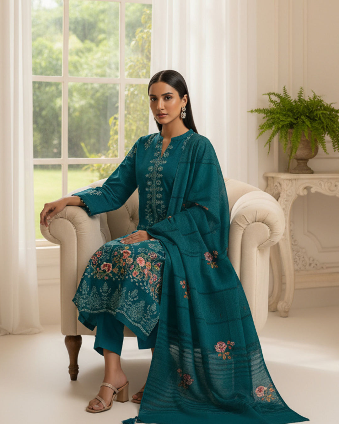 Premium plain dyed Dhanak trousers, 2.5 yards, perfectly balanced to complement the embroidered shirt and shawl.